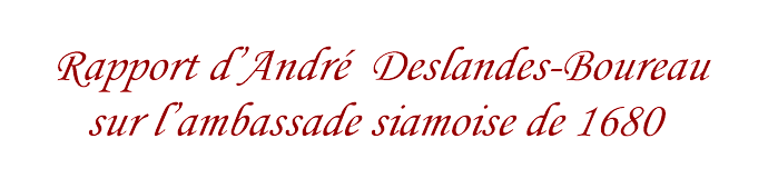 Sans doute adressé à François Baron et aux instances dirigeantes de la Compagnie des Indes, le rapport d'André Deslandes-Boureau que nous reproduisons ici couvre les événements et la préparation de l'ambassade depuis l'arrivée du Vautour à Ayutthaya le 3 septembre 1680 jusqu'au départ de la délégation le 24 décembre. Il est reproduit dans l'ouvrage d'Adrien Launay, Histoire de la Mission de Siam, 1920, I, pp. 104 à 108. Nous l'avons transcrit en français moderne, nous en avons revu la ponctuation et nous avons tâché de l'éclairer par quelques notes.