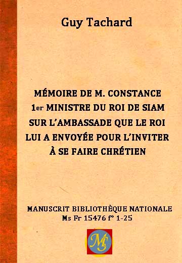 OUS l'influence des missionnaires qui s'étaient établis dans son royaume, Phra Naraï, le roi de Siam, envoya en décembre 1680 une ambassade auprès de Louis XIV. La délégation n'arriva jamais, son navire, le Soleil d'Orient ayant fait naufrage fin décembre 1681 ou début janvier 1682 au large de Madagascar. Inquiet et curieux de ne pas recevoir de nouvelles de ses envoyés, Naraï dépêcha deux dignitaires siamois pour s'informer en France de ce qui était advenu de ses ambassadeurs. Ils débarquèrent à Calais à la mi-octobre 1684, accompagnés par le missionnaire Bénigne Vachet. Ce prélat n'épargna pas ses efforts pour persuader Louis XIV que le roi de Siam, qui protégeait les chrétiens dans son royaume, envisageait de se convertir, qu'il y avait de grands profits à espérer pour la Compagnie des Indes dans le commerce avec le Siam, et qu'il était de l'intérêt de la France d'y envoyer à son tour une ambassade. Le marquis de Seignelay, secrétaire d'État à la marine, et le père de La Chaize, confesseur du roi, appuyèrent les vues de Bénigne Vachet pour convaincre le roi, tout de même assez réticent à l'idée de financer une expédition vers des contrées si lointaines. Ils y parvinrent, et le 3 mars 1685, les navires l'Oiseau et la Maligne quittaient le port de Brest pour conduire une ambassade de prestige auprès du monarque siamois.