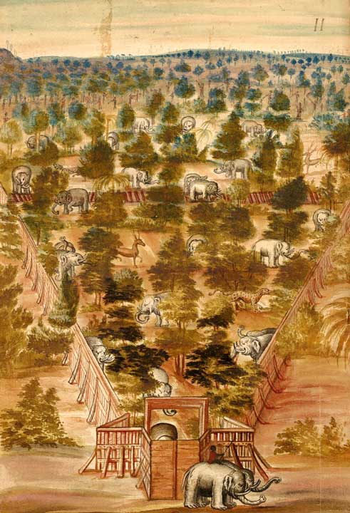 3 - Un dessin colorié est consacré à la chasse aux éléphant dans le recueil anonyme intitulé Usages du Royaume de Siam, cartes, vues et plans : sujets historiques en 1688 conservé à la Bibliothèque nationale. Il est ainsi légendé : Chasse pour prendre les éléphant. On fait une estacade ou palissade de gros pieux ou arbres entiers dont l'enceinte est triangulaire et a quelquefois deux lieues de tour ou de circuit. On laisse la base de ce triangle ouvert pour la fermer quand on veut, on a des pieux tout prêts à terre. Vis à vis de cette enceinte, on fait dans la forêt une battue de plusieurs milliers d'hommes à quelques lieues de cette palissade ; il font un très grand cercle et avec des tambours, des trompettes et des mousquets il épouvantent et font fuir les éléphants sauvages, les conduisant vers l'estacade où, les ayant réduits, ils les renferment avec les pieux préparés et pour les prendre et les apprivoiser on a une porte à l'endroit le plus étroit et l'on y fait entrer un éléphant docile qui va badiner avec le premier éléphant sauvage auquel on jette une corde au col et l'on le joint à l'éléphant domestique. On les fait sortir de cette enceinte et l'on les laisse ainsi jusqu'à ce qu'ils soient apprivoisés.