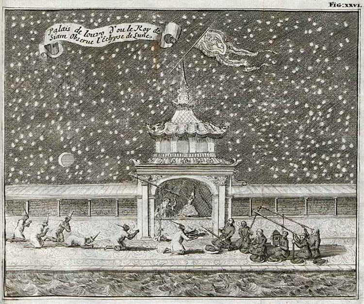 10 - Il y eut une éclipse totale de lune dans la nuit du 10 au 11 décembre. Elle est évoquée par l'abbé de Choisy dans son Journal du 11 décembre et le père Tachard indique qu'elle fut observée depuis Thale Chubson (ทะเลชุบศร) également appelé Prathinang Yen (พระตี่นั่งเย็น : la résidence fraîche), un faubourg situé à environ trois kilomètres du centre de Lopburi où le roi Naraï avait fait construire un pavillon (Tamnak Kraisorn-Sriharaj : (ตำหนักไกรสรสีหราช). Une gravure de la relation du père Tachard illustre cette scène :