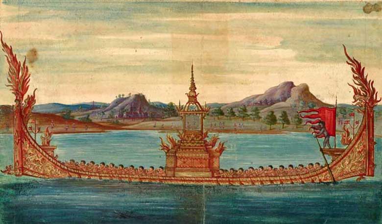Vue de la résidence du roi de Siam avec l'entrée magnifique de l'ambassadeur de France, laquelle se fit sur le Menam avec 150 balons ou navires d'État à la Siamoise, l'an 1685 au mois d'octobre. D'après le Voyage de Siam par le père Tachard.