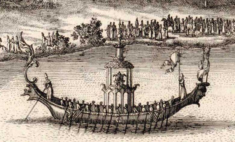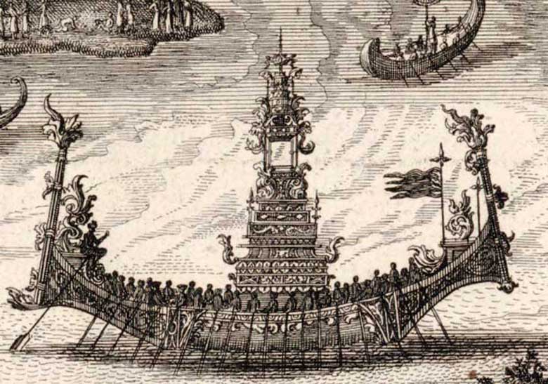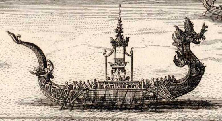 À l'égard de leurs bateaux et vaisseaux, leurs balons d'État ou bateaux que nous appelons sont les plus beaux du monde. Ils sont d'un seul arbre et d'une longueur prodigieuse. Il y en a qui tiennent 50 jusqu'à 100 et 180 rameurs. Les deux pointes sont très relevées et celui qui les gouverne donnant du pied sur la poupe fait branler tout le balon, et l'on dirait que c'est un cheval qui saute. Tout y est doré avec des sculptures très belles et au milieu il y a un siège fait en forme de trône en pyramide, d'une sculpture très belle et toute dorée, et il y en a plus de cent ornements différents, mais tous bien dorés et très beaux (1).