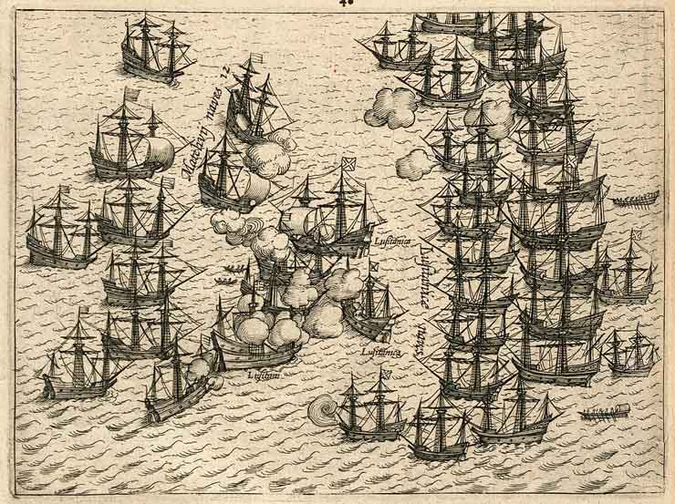Bataille de Malacca qui opposa les Hollandais aux Portugais en 1641. ⇑