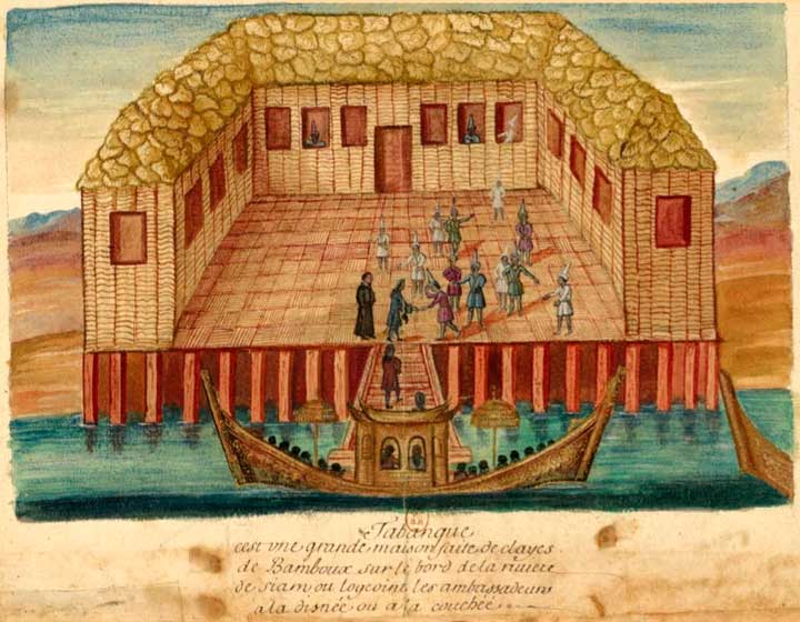 C'est une grande maison faite de claies de bambous sur le bord de la rivière de Siam, où logeaient les ambassadeurs à la dînée ou à la couchée. ⇑