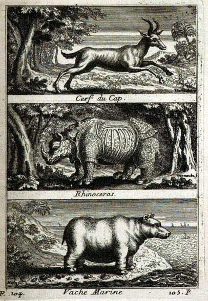 Rhinocéros, cerf du cap, vache marine.