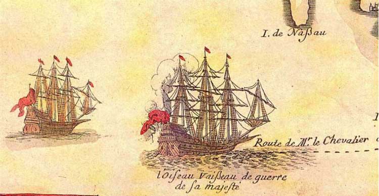 Nous montons l'Oiseau (2), vaisseau de guerre du roi de 46 pièces de canon. M. le chevalier de Chaumont, comme ambassadeur, commande tout (3). M. de Vaudricourt est capitaine du vaisseau. M. de Coriton, capitaine de frégate légère, est premier lieutenant. Les chevaliers de Forbin (4) et de Cibois en sont lieutenants. M. de Chamoreau en est enseigne. M. de Francine, enseigne, est avec nous et fera le quart. Je vous expliquerai dans la suite ce que c'est que le quart, non que je croie pouvoir vous apprendre quelque chose, mais pour l'apprendre moi en l'enseignant aux autres. Le chevalier du Fay et Freteville, gardes-marine (5), sont aussi sur notre bord.