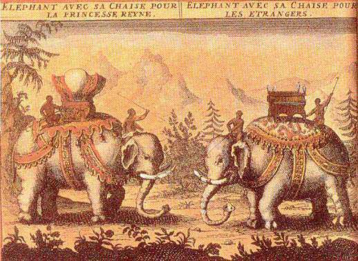 20 - C'était la grande passion de Phra Naraï. L'éléphant était, avec le buffle, le principal animal domestique des Siamois, et sa chasse était libre. Les femelles étaient utilisées pour la monte et pour les tâches usuelles. Les mâles étaient généralement réservés pour la guerre. Le père Tachard note qu'il y en avait plus de vingt mille dans l'armée siamoise. Le chiffre paraît largement exagéré. Le roi Phra Naraï qui entretenait deux mille chevaux dans son palais jugeait plus noble de se déplacer à dos d'éléphant. Les mythiques éléphants blancs étaient, depuis le règne du roi Ramkamhaeng au XIIIe siècle, les symboles de la puissance royale. Considérés comme sacrés, ces animaux avaient droit aux plus grands honneurs. Phetracha, qui prendra le pouvoir à la mort de Phra Naraï était général des éléphants, ce qui représentait une charge considérable. À noter que l'éléphant blanc figura jusqu'en 1917 sur le drapeau siamois.