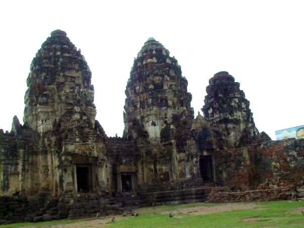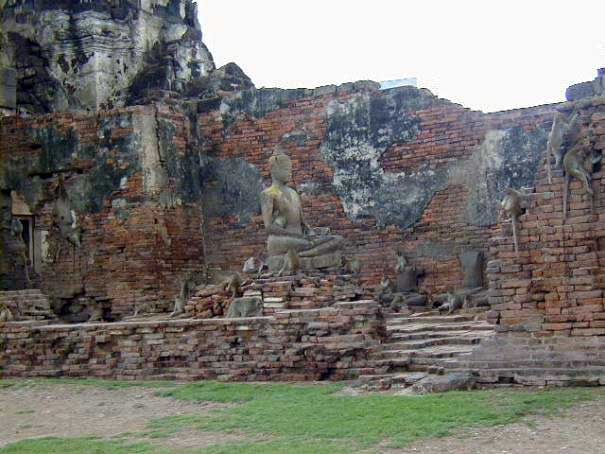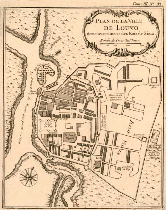 24 - Parmi les raisons qui poussèrent Phra Naraï à adopter Louvo comme résidence secondaire, peut-être la sécurité qu'offrait une résidence plus éloignée de la côte qu'Ayutthaya, peut-être les nombreux éléphants sauvages qui peuplaient les forêts environnantes et permettaient des parties de chasse dont le roi raffolait, peut-être le climat moins torride que la capitale du fait du lac qui rafraîchissait la ville, et sans doute un peu des trois. Aujourd'hui Lopburi offre l'aspect d'une petite bourgade de province, à l'écart des grands axes touristiques, et sans charme particulier, si ce n'est les milliers de singes qui circulent en toute liberté dans les rues. Quatre sites principaux témoignent du passé : le Phra Naraï Ratchanivet (พระนารายณ์ราชนิเวศน์), palais du roi Naraï, la maison Chao Praya Wichayen (บ้านเจ้าพระยาวิชเยนทร์), la résidence de Phaulkon dans laquelle étaient logés les ambassadeurs, le Phra Prang Sam Yot (พระปรางค์สามยอด) et le Wat Phra Si Rattana Mahattat (วัดพระศรีรัตนมหาธาตุ), deux constructions datant de la période Khmère. Notons que l'empreinte du roi Naraï est visible dans le Wat Phra Si Rattana Mahattat, il y fit en effet construire un curieux corps de bâtiment (wihan - วิหาร) très inspiré par nos églises occidentales.