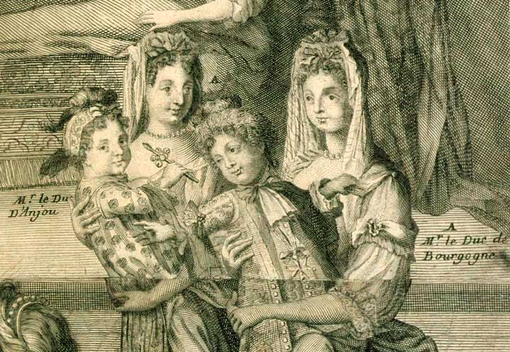 27 - Louis de France, duc de Bourgogne, petit-fils de Louis XIV, était né le 6 août 1682, et son frère Philippe, de France, duc d'Anjou, le 19 décembre 1683.