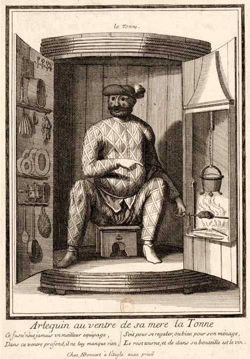 Arlequin au ventre de sa mère la Tonne. Imprimé par N. Bonnart, à l'Aigle. ⇑