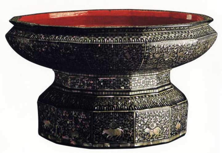 5 - Talum (ตะลุ่ม). Dans L'Ambassade de Siam au XVIIe siècle, (1862, p. 69), Étienne-Gallois écrit : Le roi l'assura [Chaumont] qu'il avait été satisfait de ses rapports personnels avec lui et de toute sa négociation, en témoignage de quoi il lui donna le Lelom, c'est-à-dire la plus haute distinction du royaume, qui faisait du titulaire un oya, quelque chose de plus qu'un duc en France. Étienne-Gallois ajoute en note : Les Portugais donnaient à cette éminente distinction le nom de bolseta. Évoquant ces boîtes honorifiques, La Loubère cite le krob (ครอบ) et le tiab (เตียบ) : Le krob est une boîte d'or ou d'argent pour l'arek et le bétel. Le roi les donne, mais ce n'est qu'à certains officiers considérables. Elles sont grosses et couvertes, et fort légères ; ils les ont devant eux chez le roi et dans toutes les cérémonies. Le tiab est une autre boîte pour le même usage, mais sans couvercle, et qui demeure au logis. C'est comme un grand gobelet, quelquefois de bois vernis, et plus la tige en est haute, plus il est honorable. Pour l'usage ordinaire, ils portent sur eux une bourse où ils mettent leur arek et leur bétel, leur petite tasse de chaux rouge et leur petit couteau. Les Portugais appellent une bourse bosseta, et ils ont donné ce nom au krob dont je viens de parler, et après eux nous les avons appelés bossettes. (Du royaume de Siam, 1691, II, pp. 70-71). Lorsqu'il évoque les talum, La Loubère les décrit ainsi : Tables à rebord sans pied, appelés autrement bandèges, et par nos marchands plateaux. (op. cit. II, p.67).