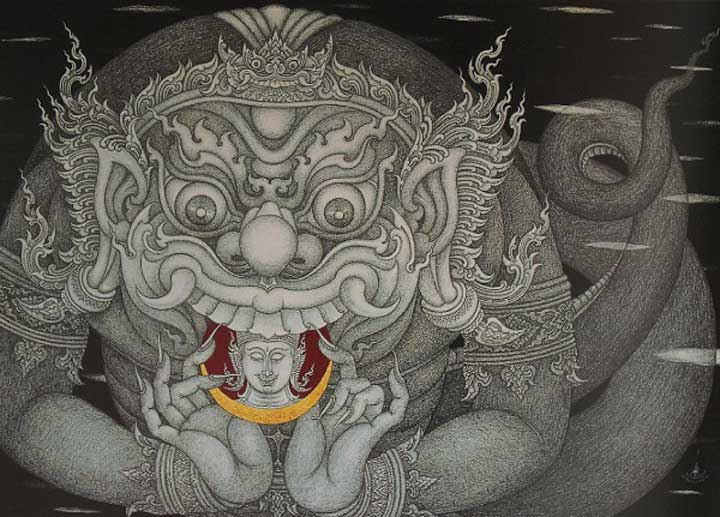 Le géant Rahu (ราหู) dévorant la lune. ⇑