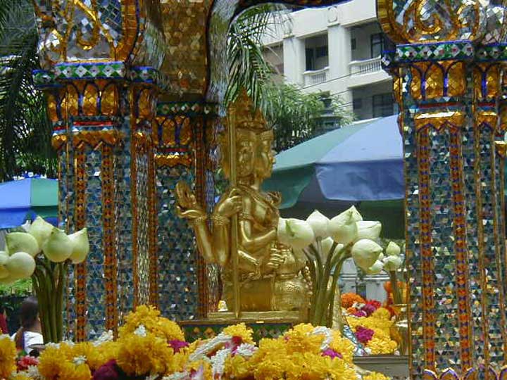 La figure de Brahma dans le sanctuaire Erawan à Bangkok. ⇑