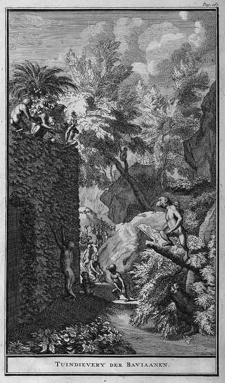 Singes pillant un jardin - Naauwkeurige Beschryving van de Kaap de Goede Hoop, Amsterdam, 1727. ⇑