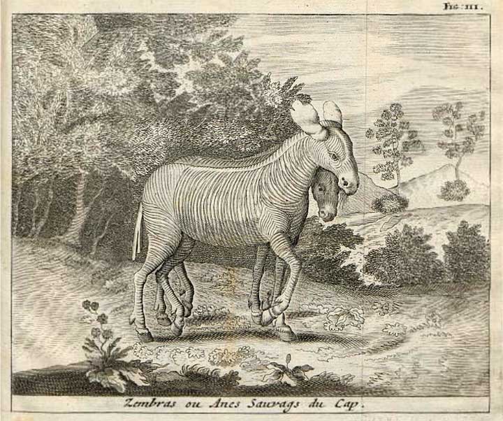 4 - On trouve également une description de cet âne dans la Description du cap de Bonne-Espérance de Peter Kolb (1741, III, pp. 23-24) : L'âne sauvage du Cap est un des plus beaux animaux que j'aie jamais vus. Il a la taille d'un cheval de monture ordinaire. Ses jambes sont déliées et bien proportionnées, et son poil est doux et uni. Depuis sa crinière jusqu'à sa queue on voit au milieu du dos une raie noire, de laquelle de part et d'autre il sort un grand nombre d'autres raies de diverses couleurs, qui forment tout autant de céroles en se rencontrant sous son ventre : quelques-uns de ces cercles sont blancs, d'autres jaunes, d'autres châtains, et ces couleurs se perdent et se confondent les unes dans les autres, de manière qu'elles forment un coup d'oeil charmant. Sa tête et ses oreilles sont aussi ornées de petites raies, et des mêmes couleurs. Celles qui brillent sur la crinière et sur la queue sont pour la plupart blanches, châtains ou brunes ; il y en a moins de jaunes.