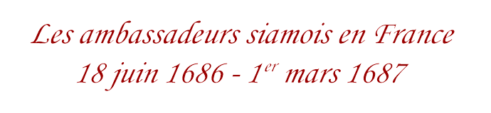 En cet an de grâce 1686, deux événements allaient marquer la France, on dirait aujourd'hui, allaient faire le buzz : la fistule anale de Louis XIV, petite tumeur devers le périnée, à côté du raphé, deux travers de doigt de l'anus, apparue dès le 15 janvier, et le séjour des ambassadeurs siamois arrivés à Brest le 18 juin. Situé dans un endroit que la pudeur répugne à nommer (on ne parlait d'ailleurs pas de l'anus de Sa Majesté, mais plutôt de sa cuisse), l'abcès mal placé, à deux doigts du fondement, ne fournit pas l'occasion de longs articles, d'impressions d'estampes ou d'almanachs, de frappes de médailles, ainsi qu'il était de tradition pour tous les événements qui touchaient à la vie du roi. La France pria en silence. Le 18 novembre, las des cataplasmes, des cautères, des badigeonnages et des bouillons purgatifs, le roi prit la décision de se faire opérer. L'intervention, menée de main de maître par le chirurgien Félix, fut un succès. La France respira, Dangeau écrivit dans son Journal : Il a souffert toute l'opération avec une patience admirable ; on lui a donné deux coups de bistouri et huit coups de ciseaux sans qu'il lui soit échappé le moindre mot, et M. Vignier composa à cette occasion un de ces fades et laborieux madrigaux dont il avait le secret : Quoi que Louis ait fait, il faut dire aujourd'hui Des cérémonies furent organisées pour célébrer la guérison complète annoncée en janvier 1687, et Lully dirigea à cette occasion son Te Deum composé en 1677. C'est au cours de la répétition qu'il s'écrasa le pied avec son bâton de direction et qu'il mourut de la gangrène le 22 mars suivant. Chargés de présents, les ambassadeurs du roi de Siam débarquèrent à Brest le 18 juin. D'emblée, la curiosité envers les exotiques émissaires fut à son comble. Pendant les huit mois et quelques jours que les mandarins passèrent dans le royaume, où ils visitèrent Paris, Versailles, et firent un long périple dans les villes du Nord, les moindres de leurs faits et gestes furent rapportés, répétés, commentés, le Mercure Galant consacra quatre numéros exceptionnels à l'événement, et M. Vignier composa à cette occasion un de ces fades et laborieux madrigaux dont il avait le secret : Les Siamois, ces têtes basanées, Nous avons regroupé dans ce chapitre quelques documents sur le séjour des ambassadeurs siamois en France : |