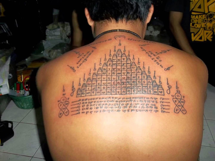 10 - Les Occidentaux qui découvrent la Thaïlande ne manquent pas de s'interroger sur ces diagrammes magiques, souvent fort élaborés, qu'on voit tracés aux endroits les plus divers, sur les portes des maisons, au dessus du pare-brise des voitures, et même tatoués sur la poitrine ou le dos de ceux qui doivent accomplir des travaux périlleux. Les yan, ou yantra (ยันต์), savantes compositions de phrases et de mots sacrés ordonnés géométriquement, sont encore fort populaires aujourd'hui et constituent, avec les amulettes, des protections recherchées contre le mauvais sort, les mauvais esprits, et les atteintes de toutes sortes. Tracés sur des vêtements, ils garantissent l'invincibilité et de nombreux militaires avouent en porter. On pourra, pour en savoir davantage, se référer à l'ouvrage de Catherine Becchetti Le mystère dans les lettres, Étude sur les yantra bouddhiques du Cambodge et de Thaïlande, publié en 1991 aux Éditions des Cahiers de France, Ambassade de France à Bangkok.