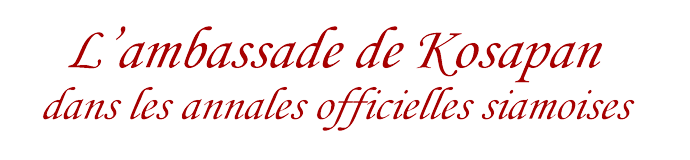 5 - Kosathibodi (โกษาธิบดี) : il s'agit de Khun Lek (ขุนเหล็ก), fils de la nourrice Bua « Dusit » (บัวดุสิต) et frère de Kosa Pan (โกษาปาน), (également frères de lait du roi Naraï) qui occupait les fonctions de Phra Klang (พระกลาง), ainsi que les Siamois désignaient cette sorte de premier ministre chargé plus particulièrement des finances et des affaires étrangères. C'est ce personnage que les relations occidentales appellent barcalon. Il y a toutefois de grandes confusions dans les Phongsavadam (พงศาวดาร), puisque les Annales n'évoquent qu'une seule ambassade siamoise qui aurait duré trois ans. Kosa-Thibodi, mort vraisemblablement en juillet 1683, n'avait pu être à l'origine ni de l'ambassade de 1686, ni même de celle de 1684 qui débarqua à Calais à la mi-octobre 1684. De la même façon, la présence des Français au Siam n'est pas même évoquée dans les Annales. ⇑