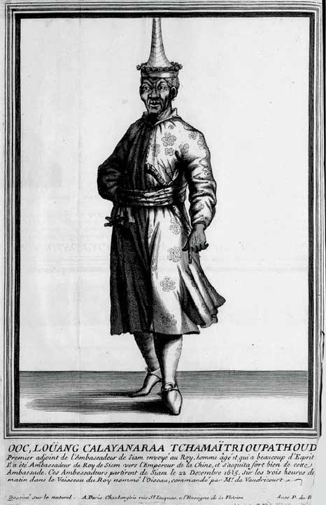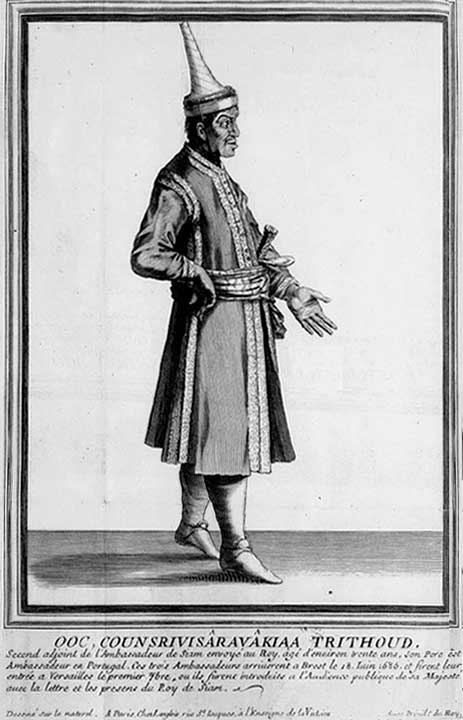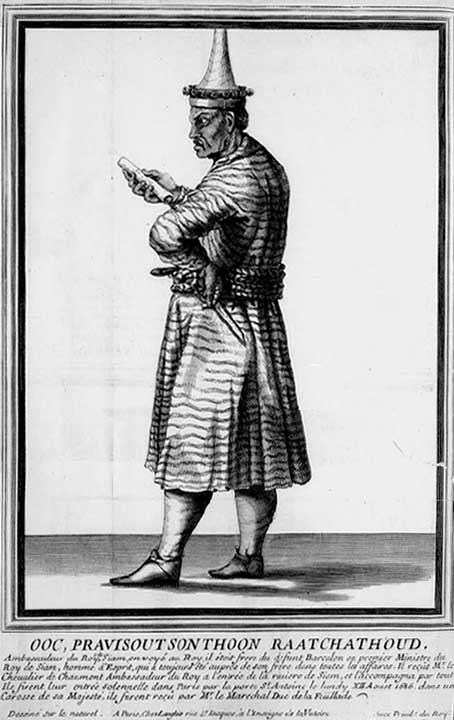 18 - Okphra Visut Sunthon (ออกพระวิสุทธิสุนทร) dit Kosapan (โกษาปาน). Il était assisté d'Okluang Kanlaya Ratchamaïtri (ออกหลวงกัลยาราชไมตรี) et d'Okkhun Siwisan Wacha (ออกขุนศรีวิสารวาจา). Leurs portraits et leurs descriptions furent à l'époque largement diffusés en France par les gazettes, les gravures, les almanachs ou les médailles. La mode siamoise faisait fureur, les femmes portaient des déshabillés en étoffe siamoise et l'on trouvait des bonnets et des éventails siamois à la foire Saint-Germain. Le manuscrit de Sainctot contient trois gravures représentant ces ambassadeurs :