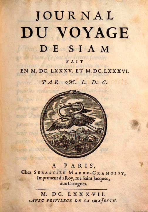 5 - La première édition du Journal du voyage de Siam fait en 1685 et 1686 par M.L.D.C. (M. l'Abbé De Choisy) sera imprimée par Mabre-Cramoisy en 1687.