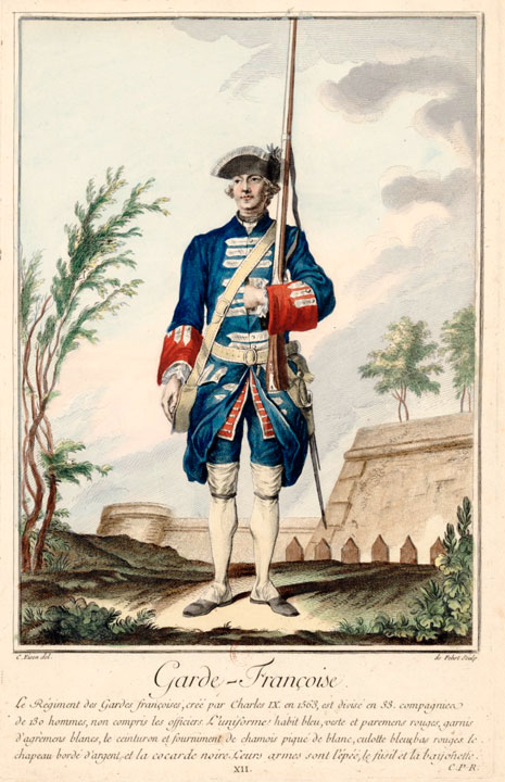 Le régiment des Gardes françaises, créé par Charles IX en 1563, est divisé en 33 compagnies de 130 hommes, non compris les officiers. L'uniforme habit bleu, veste et parements rouges, garnis d'agréments blancs, le ceinturon et fourniment de chamois piqué de blanc, culotte bleue, bas rouges, le chapeau bordé d'argent et la cocarde noire. Leurs armes sont l'épée, le fusil et la baïonnette.