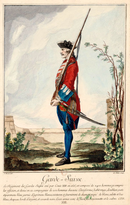 Le régiment des Gardes suisses, créé par Louis XIII en 1616, est composé de 2 400 hommes, y compris les officiers, et divisé en 12 compagnies de 200 hommes chacune. L'uniforme, habit rouge, doublure, veste et parements bleus garnis d'agréments blancs, ceinturon et fourniment de chamois piqué de blanc, culotte et bas bleus, chapeau bordé d'argent et cocarde noire. Leurs armes sont le fusil, la baïonnette et le sabre. ⇑