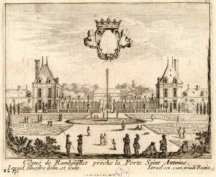 8 - Il s'agissait d'un grand terrain connu dès 1676, qu'un particulier de ce nom avait acheté, et qu'on nommait le Jardin de Reuilly, et quelquefois les Quatre pavillons. Il y fit élever une belle maison et planter un vaste et magnifique jardin que l'on venait voir par curiosité. En 1720, un nouvel acquéreur qui préférait l'utile à l'agréable, changea les bocages en vergers, et les parterres en marais potagers, n'y laissant subsister que le logement du jardinier. La maison de Rambouillet a donné son nom à la rue voisine. (Hurtaud, Dictionnaire historique de la ville de Paris, 1779, IV, pp. 210-211).