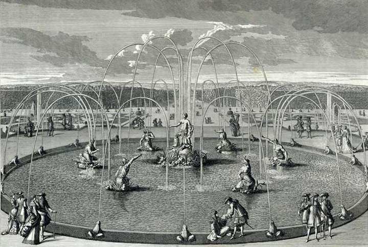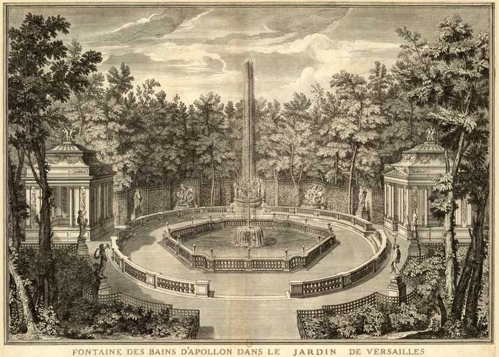5 - Ce bosquet fut achevé en 1674 et subit au fil des années de nombreuses modifications. Dans son Journal du 28 août 1684, (1854, I, p. 48) Dangeau notait : [le roi] se promena longtemps à pied dans son petit parc, visita quelques-unes des plus belles fontaines, et ordonna quelques changements à celle qui s'appelle la Montagne d'Eau.