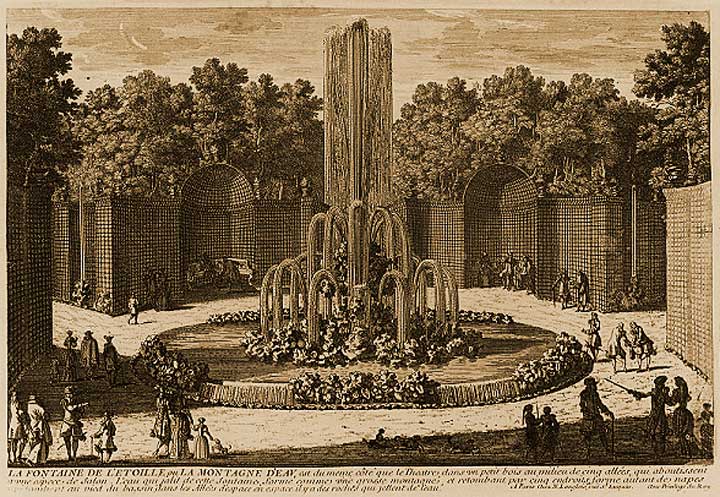 De là on passe dans un bosquet appelé la Montagne d'Eau, ou la Fontaine de l'Étoile, parce que la principale fontaine qui en occupe le milieu, est entourée de cinq allées qui toutes ensemble forment la figure d'une étoile. On trouve aux deux côtés de ces allées des rochers d'où sortent des jets d'eau qui tombent dans une rigole. La place au milieu de laquelle est la principale fontaine, est environnée d'un treillage orné d'architecture et de pilastres. Il y a tout autour des enfoncements cintrés ou portiques, dans lesquels sont des bancs qui suivent la même figure. Tout le dessus de ce treillage est orné de vases de différentes figures, qui sont remplis de tout ce qui peut donner de l'agrément à ce lieu par la diversité des fleurs mêlées de verdure. Les jets d'eau qui sont dans le principal bassin, n'étant pas également élevés, forment comme une montagne d'eau, du haut de laquelle s'élance encore un gros jet. Je ne finirais point si je voulais entrer dans un plus ample détail ; il suffira de vous dire que les eaux produisent encore d'agréables et nouveaux effets autour du bord de ce bassin (5).