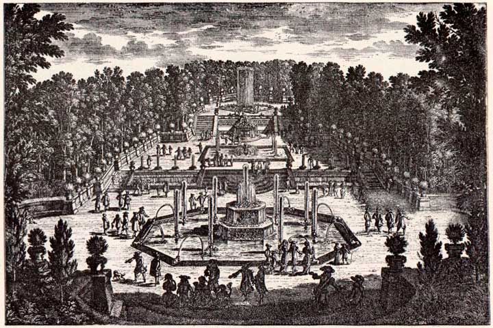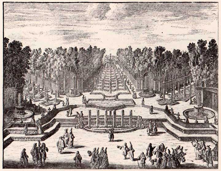 Les ambassadeurs admirèrent, non seulement les eaux qui sont en ce lieu, mais encore la manière galante dont il est construit. Il furent ensuite conduits au Théâtre d'Eau. Il est ainsi appelé à cause des diverses figures que les jets d'eau dont il est rempli, y représentent (6). Il offre d'abord à la vue trois allées d'eau qui font la patte d'oie, et qui sont plus élevées que le lieu d'où on les voit, parce que le terrain va en montant. Elles sont bordées de treillage. Aux deux côtés de celle du milieu sont deux enfoncements cintrés et treillissés qui la séparent des deux autres. Au-devant de ces cintres, on voit deux bassins, dans lesquels sont encore d'autres bassins plus petits et plus élevés, de manière que les jets d'eau qui en sortent les remplissant trop, font des nappes d'eau tout autour. Il y en a encore de pareils par-delà les deux autres allées ; ainsi chaque allée en a à ses deux côtés. L'allée du milieu est plus élevée, et l'on y voit des cascades qui font quatorze ou quinze nappes d'eau les unes sur les autres, et ces cascades et ces nappes sont formées par un très grand nombre de jets, puisque cette allée en a cinq dans sa largeur, qui continuant jusqu'au bout, font paraître six allées d'eau. Au bas de cette allée est un grand bassin, qui occupe toute la face des cascades et qui en reçoit l'eau, et plus bas encore il y a un autre bassin rempli de six gros jets. Les allées des côtés ont chacune des jets d'eau dans leur largeur, qui forment trois allées d'eau ; ils sont dans un bassin qui continue tout le long de l'allée, et comme elle est en pente et qu'on a mis d'espace en espace de quoi arrêter l'eau, elle forme des nappes tout le long de la même allée, et ces nappes, des cascades, qui accompagnent celles de l'allée du milieu. Entre le treillage et les jets d'eau de ces trois allées, il y a six rangs de petits arbres, qui étant taillés de différentes manières, représentent diverses figures. Je ne parlerai point du reste des ornements qui embellissent ce lieu, mais comme il est fait pour les divers changements des jets d'eau qui imitent les décorations de théâtre, je vous dirai qu'il y en a de cinq sortes. Les jets s'élancent d'abord en haut, et demeurent droits ; ensuite il se courbent et font des berceaux en-dedans et puis en-dehors ; après cela ils forment des cercles en avant, qui étant changés tout-à-coup paraissent en arrière. Il est aisé de s'imaginer que les divers spectacles que ces eaux donnèrent aux ambassadeurs les divertirent beaucoup, car quoiqu'ils eussent vu tout ce que les eaux peuvent produire de beau, rien ne leur avait encore marqué tant de différents effets produits par les mêmes jets.