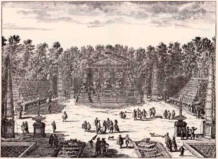 Vue du bassin de Latone en 1678. Gravure de Pierre Lepautre. ⇑