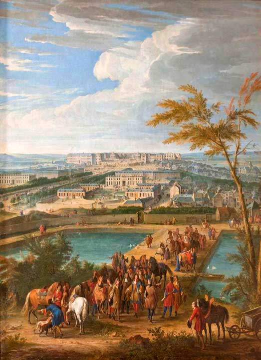 Le lendemain, les ambassadeurs allèrent voir le château de Marly. Comme il n'y a peut-être rien au monde d'une construction si particulière, ni qui soit si galant et si magnifique tout ensemble, je crois que vous serez bien aise d'en avoir une description. Ce château qui tient au parc de Versailles, est renfermé dans un parc particulier sur le chemin de Saint-Germain. Il est situé dans un vallon, au bout duquel et par l'échappée de la gorge on découvre le château de Saint-Germain et ses environs, ce qui forme une des plus belles vues qu'on se puisse imaginer. La plus considérable dépense de cette maison a été dans l'accommodement qu'il a fallu faire pour combler ce vallon qui était marécageux, pour donner de l'étendue au jardin et pour faire un plan aussi extraordinaire que celui de cette situation. La distribution du plan est unique en son espèce. On y arrive par le chemin de Saint-Germain, où il se présente d'abord une cour ronde de 50 toises, avec des corps-de-garde, remises et écuries, d'où l'on aperçoit le château au bout d'une longue avenue de 115 toises de long, et de 10 de large, fermée de murs de chaque côté pour retenir les terres de part et d'autre. Elle est plantée d'arbres, et le chemin est pavé, et de l'avenue on descend à l'avant-cour. Le corps du château est détaché de douze autre pavillons, six de chaque côté, qui sont séparés les uns des autres.