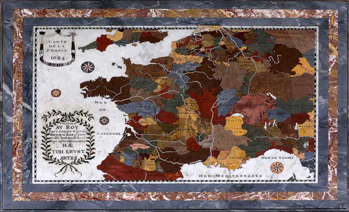 Après que les ambassadeurs eurent vu dans le même lieu une cassette remplie de plusieurs petites figures d'or, on la leva de dessus une table beaucoup moins considérable par sa matière, que pour l'art, et pour l'usage auquel elle est destinée. Elle a trois pieds et demi de long sur deux et demi de large. Le fond est d'un marbre blanc sur lequel on a fait de pièces de marbre de rapport, une carte de la France réduite dans toutes les précisions des dernières observations astronomiques. Chaque province y est distinguée par un morceau de marbre d'une couleur qui lui est particulière, et taillé de la figure irrégulière que chaque province forme par ses enclaves, avec les provinces qui la bornent. Le nom de chaque province est marqué en lettres d'or capitales, et le nom de ses principales villes en italiques. L'on a affecté de mettre proche l'un à l'autre les couleurs de marbre qui coupent davantage, par exemple, l'Ile de France d'un bleu clair, la Champagne d'un rouge de porphyre, l'Orléanais, opale, et la Beauce feuille morte ; mais la délicatesse de l'ouvrage, et l'art de l'ouvrier paraissent particulièrement dans les découpures que la mer et la terre font ensemble, où tous les caps que la terre fait dans la mer, et toutes les baies que la mer forme dans la terre, sont observés avec une justesse inconcevable, et dans les lacs et rivières qui sont de marbre blanc, et réservés du fond même de la table, nonobstant le peu de largeur, qui n'est souvent qu'un filet dans l'origine des rivières, et les différents tours qu'elles prennent dans les terres (6). On ne saurait croire combien ces lignes de lait qui serpentent au travers de ces différents marbres où le brun domine, et ces lettres d'or qui brillent sur le tout sont un objet agréable à la vue. Dans l'espace du marbre blanc qui marque la mer Méditerranée, est une boussole de différent marbre délicatement travaillée, et dans l'autre espace qui est pour la mer Océane, il y a deux cartouches, dans l'un desquels est écrit Carte de la France, avec ces mots tirés de Virgile, et qui sont une espèce de devise dont la France est le corps : Hae tibi regis artes (7), pour marquer que de tous les arts où le roi pouvait exceller, il s'est réservé le plus glorieux et le plus difficile, qui est celui de régner. Dans l'autre cartouche est le nom de celui qui a présenté cette carte au roi. L'Océan du côté du nord-est est borné par les côtes d'Angleterre, qui approchent le plus de la France, ce que l'on a de coutume de mettre dans les cartes de France, du même ouvrage et du même dessin, avec la même exactitude que le reste. La bordure est composée de deux bandes de marbre bleu, dont l'une est chargée de sa moulure, et d'une de marbre noir, sur laquelle sont marqués les degrés de longitude par de petits carrés longs de marbre blanc, qui ont été aussi réservés du fond de la table. M. Couplet, maître de mathématique, la présenta à Sa Majesté le premier jour de l'an 1684. Le roi la reçut avec sa bonté ordinaire, et la fit placer dans le cabinet dont je viens de vous parler.