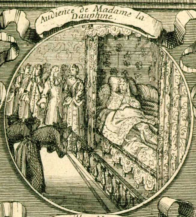 Audience de Mme la Dauphine, détail d'un almanach de 1687. ⇑