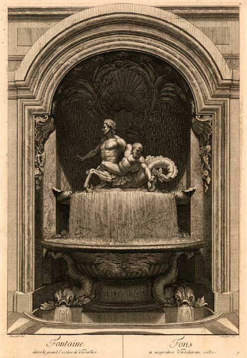 On monte par trois degrés, et trois arcades, opposées sur le premier palier, large de 55 pieds, et sur la profondeur large de 28. Il est revêtu tout autour, comme le bas, de compartiments de marbre. En face de ces trois arcades, il y a un escalier à pans de 11 degrés de marbre. Le palier de dessus est de 11 degrés en carré. Dans la face et l'épaisseur du mur est une niche surbaissée, et dedans un bassin de marbre, soutenu de dauphins de bronze. Deux tritons qui sont dessus supportent une double coquille de marbre, ornée d'un masque jetant de l'eau dans un panier rempli de coquilles. Ce panier forme une nappe qui tombe dans le bassin de marbre, et qui se décharge par un autre masque, et par les deux dauphins, le tout en bronze (8).