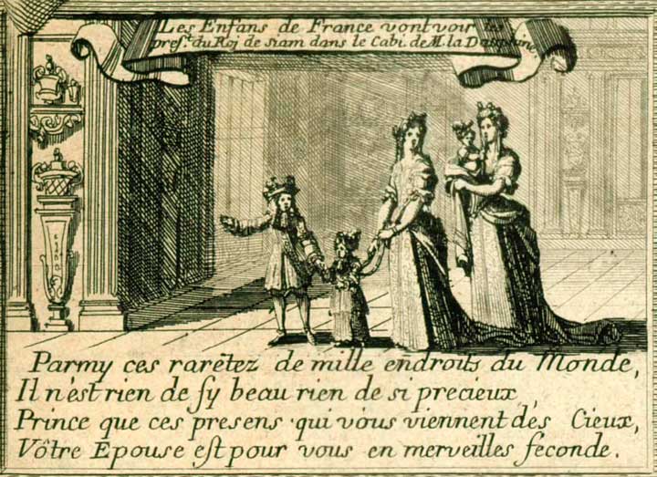 Les enfants de France vont voir les présents du roi de Siam, détail d'un almanach de 1687.