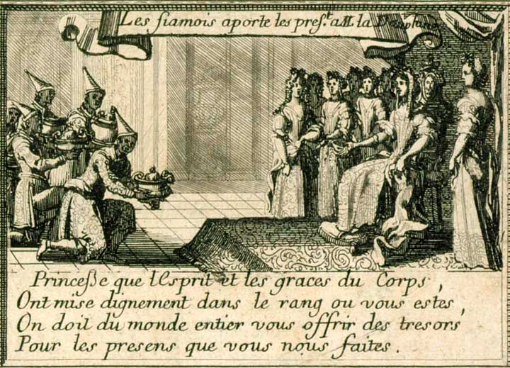 Les Siamois apportent les présents à Mme la Dauphine, détail d'un almanach de 1687.