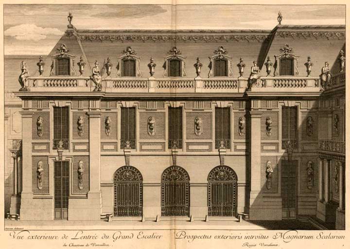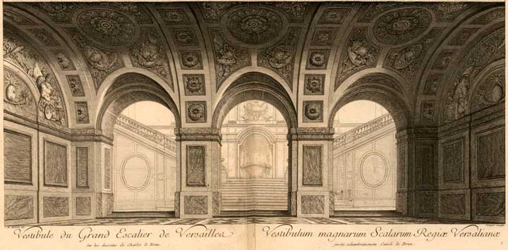 Ils virent le même jour le grand escalier de Versailles, qui fait tant de bruit dans le monde, et qui peut être comparé au plus bel appartement qu'il y ait sur la terre, si toutefois il s'en peut trouver un aussi riche. Cet escalier a 11 toises de long sur 5 de large, dans lesquelles largeurs sont compris les degrés d'en-bas, et celles des rampes. On entre par trois arcades de face dans un vestibule de 39 de large sur 13 de profondeur, dont le bas est à compartiment de marbre, et la voûte d'ornement et trophées en bas-relief doré.