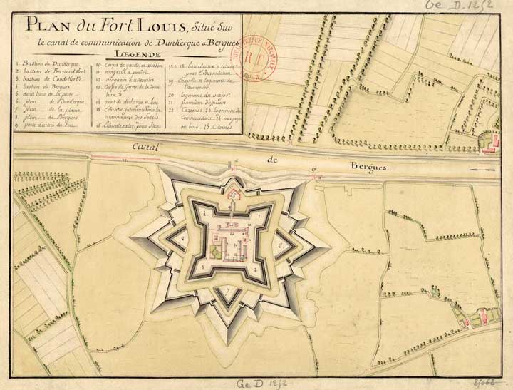 15 - La ville de Bergues, devenue française en 1668 par le traité d'Aix-la-Chapelle, faisait partie de la première ligne du pré carré, la ceinture de villes fortifiées conçu par Vauban pour protéger les nouvelles frontières du royaume. Le Fort François, ou Fort Français, renommé Fort Vallière, était à l'origine une redoute espagnole dont Vauban fit un fort de premier ordre en 1676. Le Fort Louis fut construit la même année.