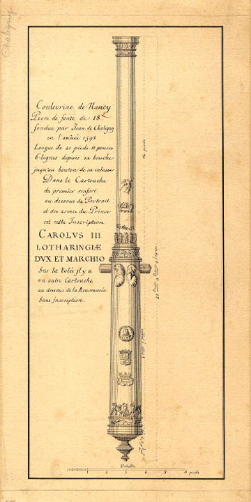 Dessin de la couleuvrine de Nancy. Musée lorrain, Palais des ducs de Lorraine. ⇑