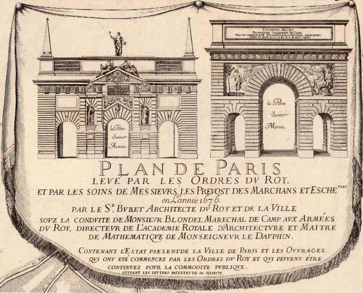 14 - De l'architecte Nicolas-François Blondel, plus couramment appelé François Blondel (1618-1686), il reste la Porte Saint-Denis, dans le 2ème arrondissement de Paris, ainsi que le nom d'une petite rue qui fut pendant longtemps un des hauts lieux de la prostitution dans la capitale. Avec son élève Pierre Bullet (1639-1716), François Blondel dressa une précieuse carte de Paris qui représente l'état de la ville en 1676.