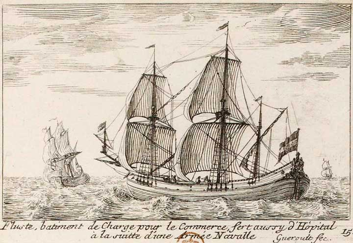 15 - Bâtiment de charge, appareillé comme les autres vaisseaux, mais étroit, fort plat de varangues, aussi rond à l'avant qu'à l'arrière, et dont le ventre est si gros, qu'il a une fois plus de bouchin vers le franc tillac, qu'au dernier pont. (...) En France, le mot flûte ne désigne pas seulement un bâtiment particulier. C'est le nom général qu'on donne à tous vaisseaux qu'on fait servir de magasin ou d'hôpital à l'armée navale, ou qui font employés à transporter des troupes. (Savérien, Dictionnaire de marine, 1758, pp. 420-421).