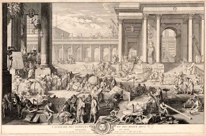 L'Académie des Sciences et des beaux-arts dédiée au roi. Estampe de Sébastien Le Clerc, 1698. ⇑