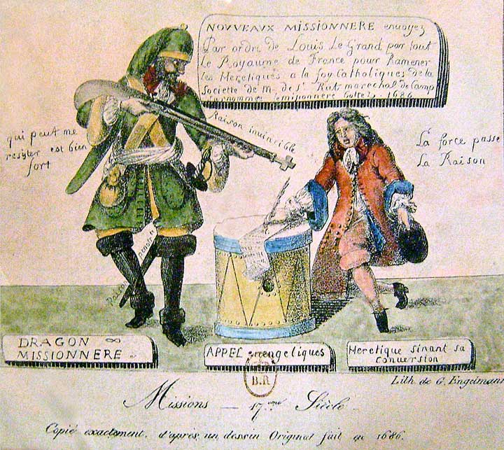 Les dragonnades. Dessin anonyme de 1686. ⇑