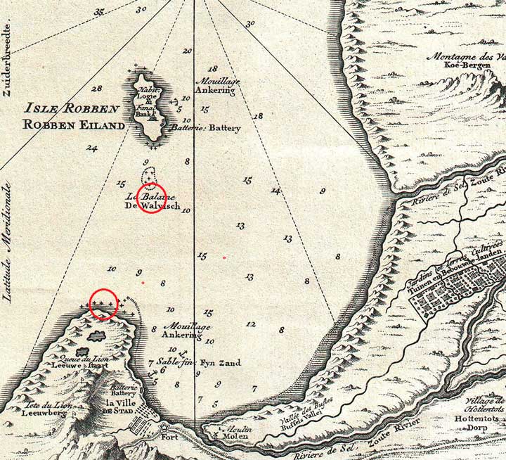 2 - Cette pointe du Lion deviendra au XVIIIe siècle la Pointe des pendus, ainsi nommée, parce qu'on a vu longtemps des squelettes de quelques criminels qui s'étaient révoltés contre les officiers de leurs vaisseaux, qu'ils avaient ensuite assassinés. Ils furent pris et subirent la peine due à leur crime ; on les exposa sur cette pointe pour servir d'exemple aux matelots. (Grandpré, Dictionnaire universel de géographie maritime, 1802, II, p. 136). Quant à la Baleine, il ne s'agit pas d'une île, mais d'un rocher considérable et assez dangereux situé au nord de l'entrée de la baie de la Table, au cap de Bonne-Espérance, au nord de la pointe aux pendus, et au sud de l'île Robin. Il y a passage entre cet écueil et l'île. (Grandpré, op. cit., p. 313).