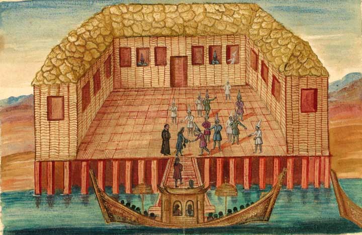 Chantaboun est situé au pied d'une de ces grandes montagnes qui font une longue chaîne du septentrion au midi, et qui séparent le royaume de Siam de celui de Cambodge. Il est sur une hauteur au milieu des bois. Du côté que nous y entrâmes, il paraissait enfermé d'une enceinte de vieilles planches plus propres à défendre les habitants des bêtes sauvages qu'à les assurer contre les ennemis. Ayant marché plus d'un quart d'heure, et presque toujours dans l'herbe jusqu'aux genoux, nous arrivâmes enfin à la maison du gouverneur. Un de ses domestiques accourut et nous fit signe d'arrêter. Il dit à notre interprète que nous pouvions attendre dans la salle du Conseil qu'il nous montrait, et qui n'était pas assurément comme les nôtres en France. Elle consistait dans une couverture de feuilles de roseaux, soutenue par des piliers de bois aux quatre coins et au milieu. Le plancher était élevé d'environ cinq pieds au-dessus de la plate terre, et l'on y montait sans autre façon par une pièce de bois toute ronde et un peu inclinée. Nous attendîmes près d'une heure dans la salle, que le Conseil s'y rendît avec le gouverneur, qui était malais, âgé d'environ quarante ans, et de la religion mahométane.