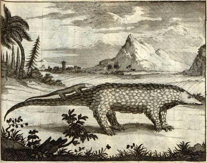 Pangolin de Malaisie, illustration du Second voyage du père Tachard (1689). ⇑