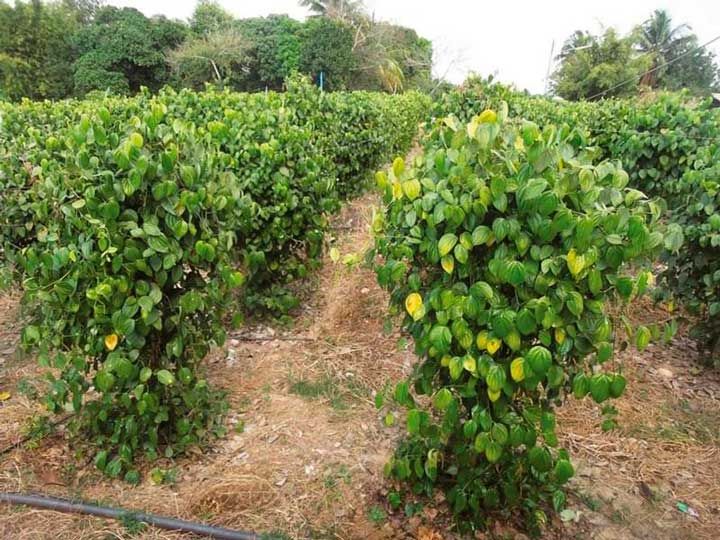 Le poivrier est un arbrisseau rampant, qui pour s'élever a besoin d'appui. On le plante au pied de quelque arbre, afin qu'il s'y puisse attacher. Les Siamois se servent pour cela d'un petit arbre épineux qu'ils nomment Mae ton lang (2), ou bien on lui met des perches comme on fait aux haricots en Europe ; nous en vîmes de ces deux manières. La tige a ses nœuds semblables à ceux de la vigne, le bois même quand il est sec ressemble parfaitement à du sarment, au goût près, qui est fort âcre. Quand il est vert, il est lissé et d'un vert olivâtre. Cette tige pousse quantité de branches de tous côtés qui s'attachent au hasard. La feuille, quand l'arbre est jeune, est d'un vert uni et blanchâtre qui devient plus enfoncé à mesure que l'arbre croît. Elle garde toujours sa blancheur par-dessus. Sa figure est ovale, un peu diminuée à l'extrémité et terminée en pointe. Elle a six nervures, dont cinq partant de la principale vers le bas pour s'y venir rejoindre en haut, forment trois autres ovales semblables à la première. On ne distingue bien que cinq de ces nervures dans les petites feuilles. Ces nervures se communiquent par un tissu de fibres assez grossières. Les plus grandes feuilles que nous vîmes à InnebourieIn Buri (อินทร์บุรี) à 85 kilomètres au nord d'Ayutthaya.