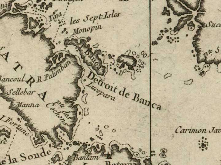 1 - Faute d'atlas suffisamment détaillé, cette île m'a posé problème. On trouve de nombreuses épellations : Lucapara, Lusepara, Lucepara, Lucipara, etc. Il existe une île Lucepara dans la mer de Banda, mais beaucoup trop éloignée pour être celle désignée par Tachard. Xavier de Castro et Henja Vlaardingerbroek assimilent Lucipara à Pulau Lepar, à l'est de la pointe sud de Sumatra (Le Naufrage de Bontekoe et autres aventures en mer de Chine (1618-1625), Chandeigne, 2001, p. 200). Cette suggestion n'est pas satisfaisante, Pulau Lepar n'est pas vraiment sur la route du détroit de Bangka et ne correspond absolument pas à la position, même approximative, indiquée sur les cartes de l'époque. Il s'agit plus probablement de Pulau Maspari, ou d'une île voisine plus petite encore qui ne figure pas sur la plupart des cartes.