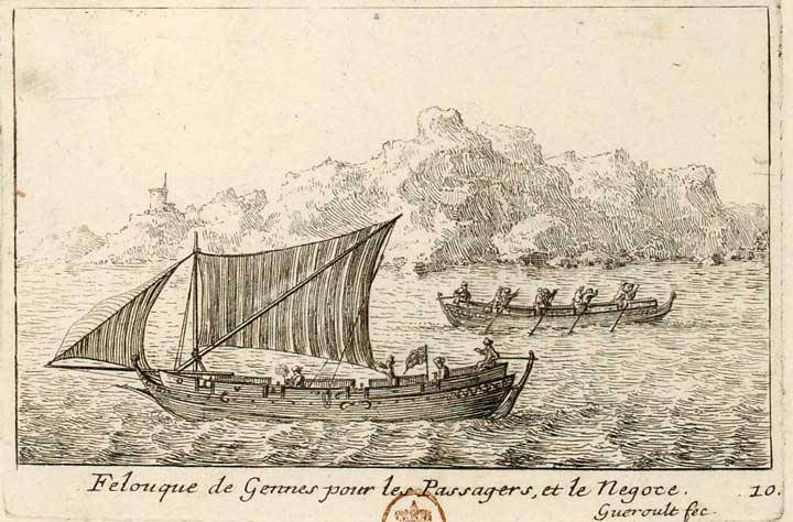 Felouque de Gênes. Estampe de Pierre-Jacob Gueroult du Pas, 1710. ⇑
